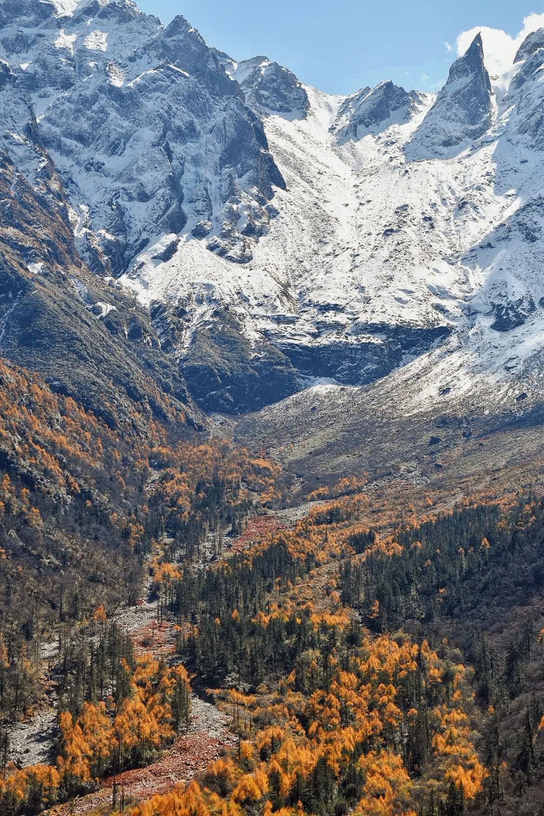เดือนตุลาคมถึงกลางเดือนพฤศจิกายนเป็นช่วงที่ใบไม้ในบีเผิงโกว, ลี่เสี่ยวลู่, ภูเขาซื่อกูเนียง และธารน้ำแข็งต้าซู่เปลี่ยนสีสวยงามที่สุด